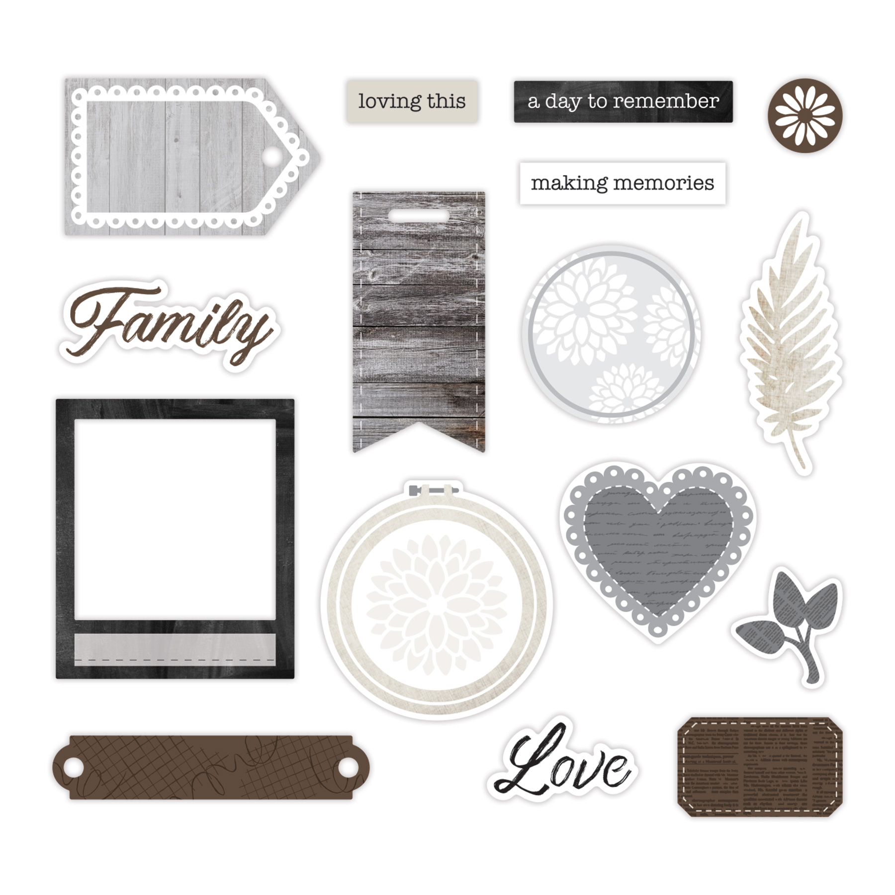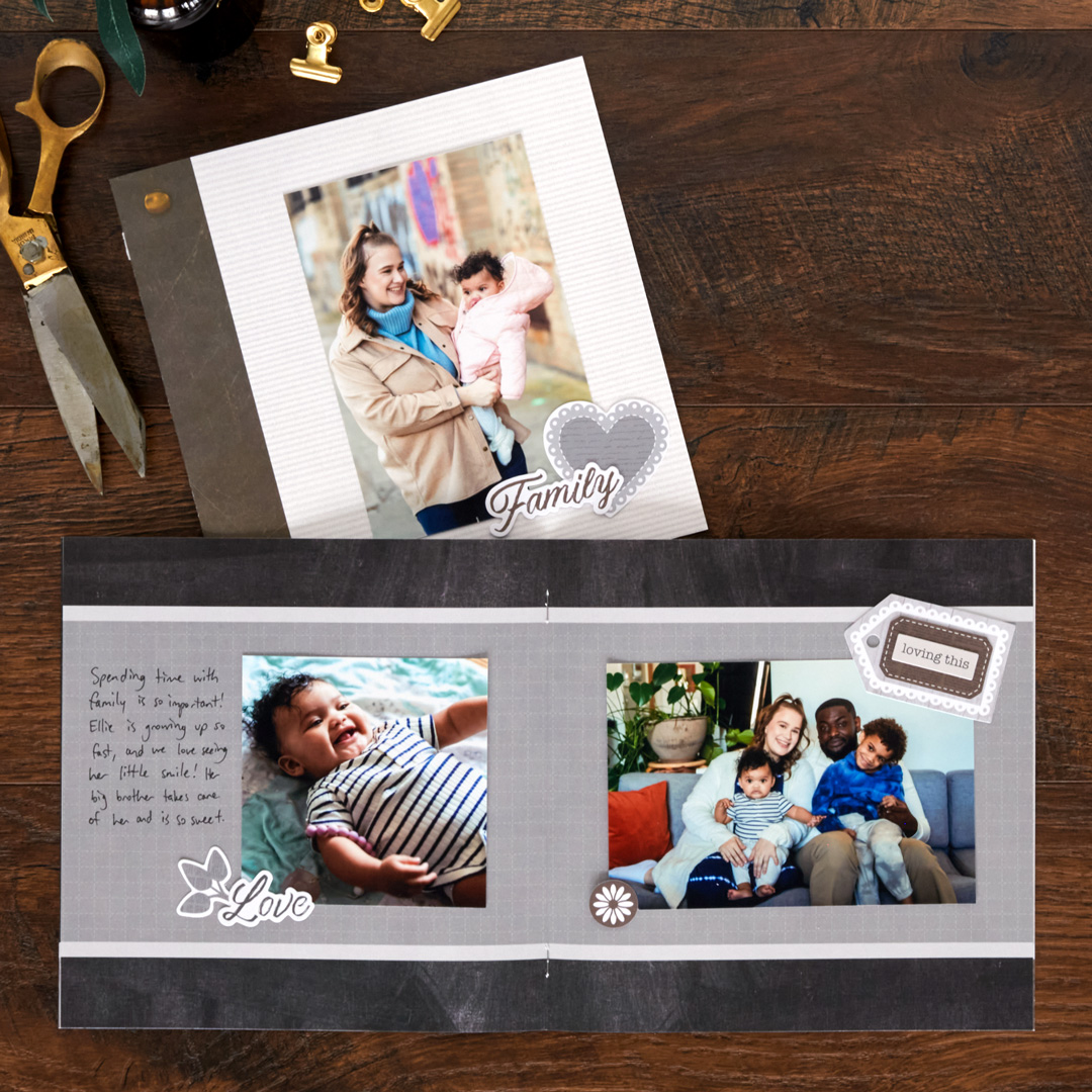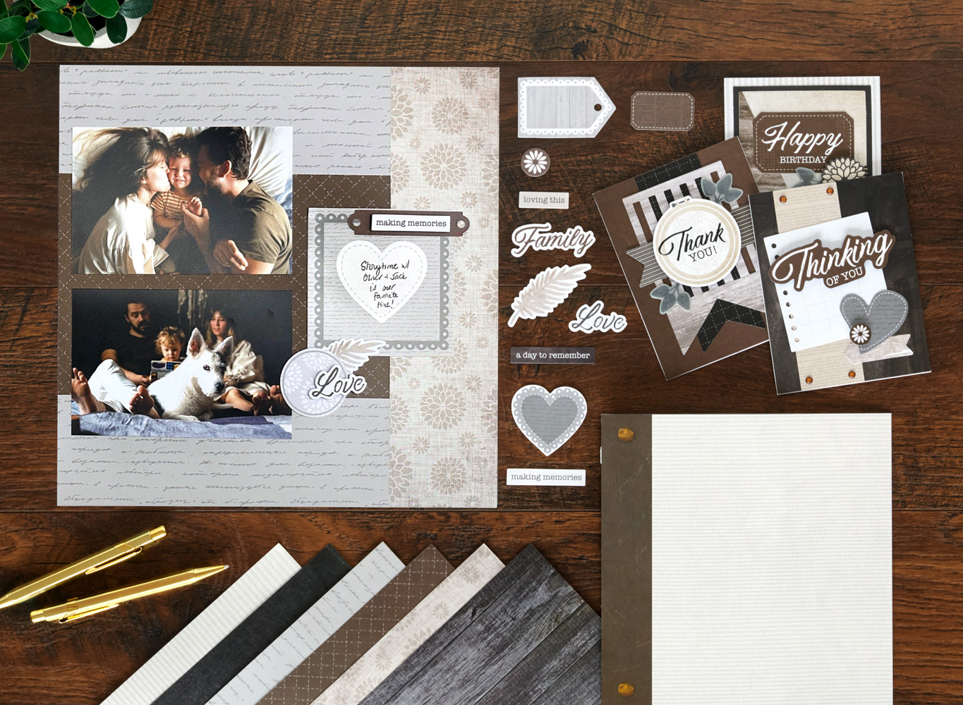 This paper pack, embellishment set and paper scrapbook album was created for Creative Memories along with marketing assets. Featuring neutrals and grunge textures, the embellishments and papers layer perfectly to feature cherished memories for your scrapbook. Assisted with photography art direction with styling and props.